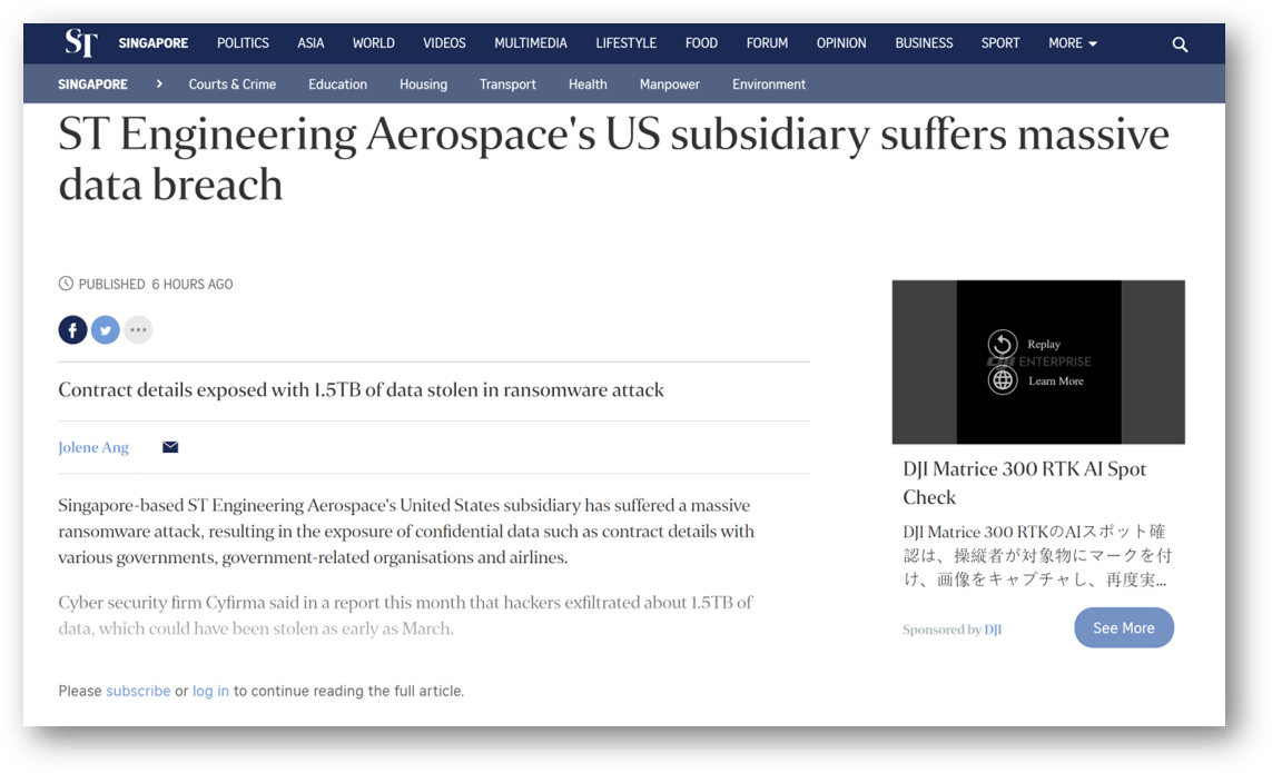 ST ENGINEERING AEROSPACE’S US SUBSIDIARY SUFFERS MASSIVE DATA BREACH