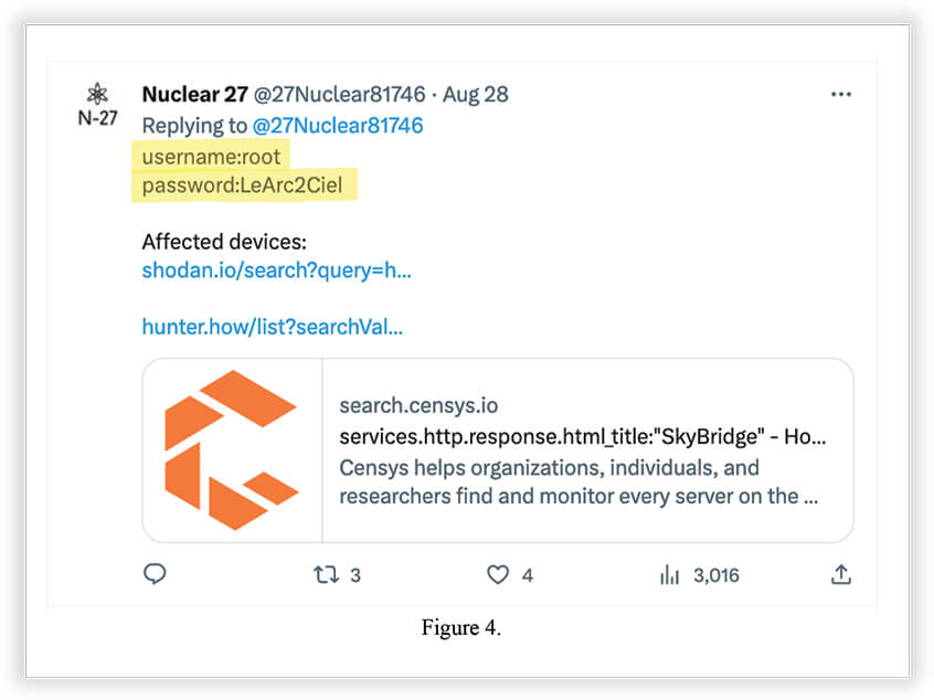 We assume Nuclear 27 created a simple script using the exposed credentials to log into unpatched devices, change their http.title and deface the WebUI login page to show off on Twitter via Shodan and Censys.