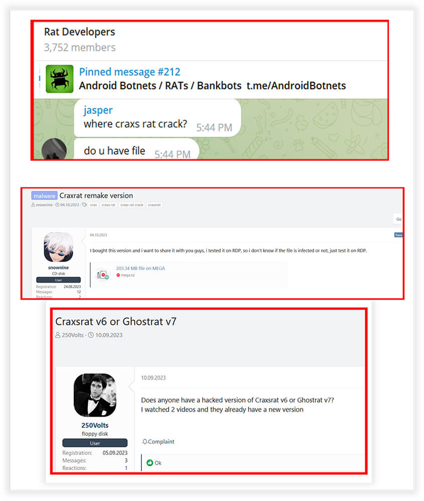 We have included a few screenshots highlighting some of our observations regarding the demand for CraxsRat in underground forums and Telegram channels. These screenshots provide clear indications of the increasing demand for CraxsRat among cybercriminals pursuing various objectives.